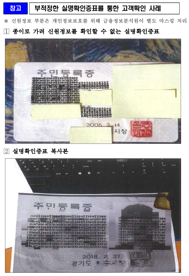 - 고객확인 시 실명확인증표 복사본(흑백/컬러) 또는 이미지 파일만으로 확인 처리한 사례: 34,477건