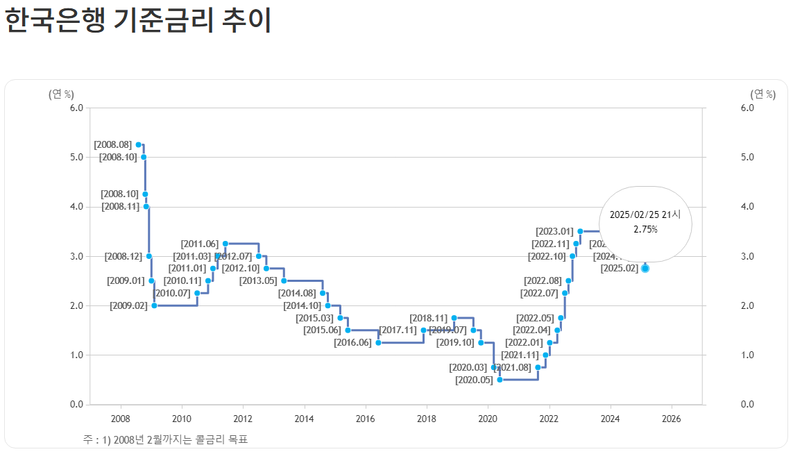 25년 2월 25일 한국은행 금융통화 위원회가 기준금리를 3.00%에서 2.75%로 인하한다고 발표했어요. 📉